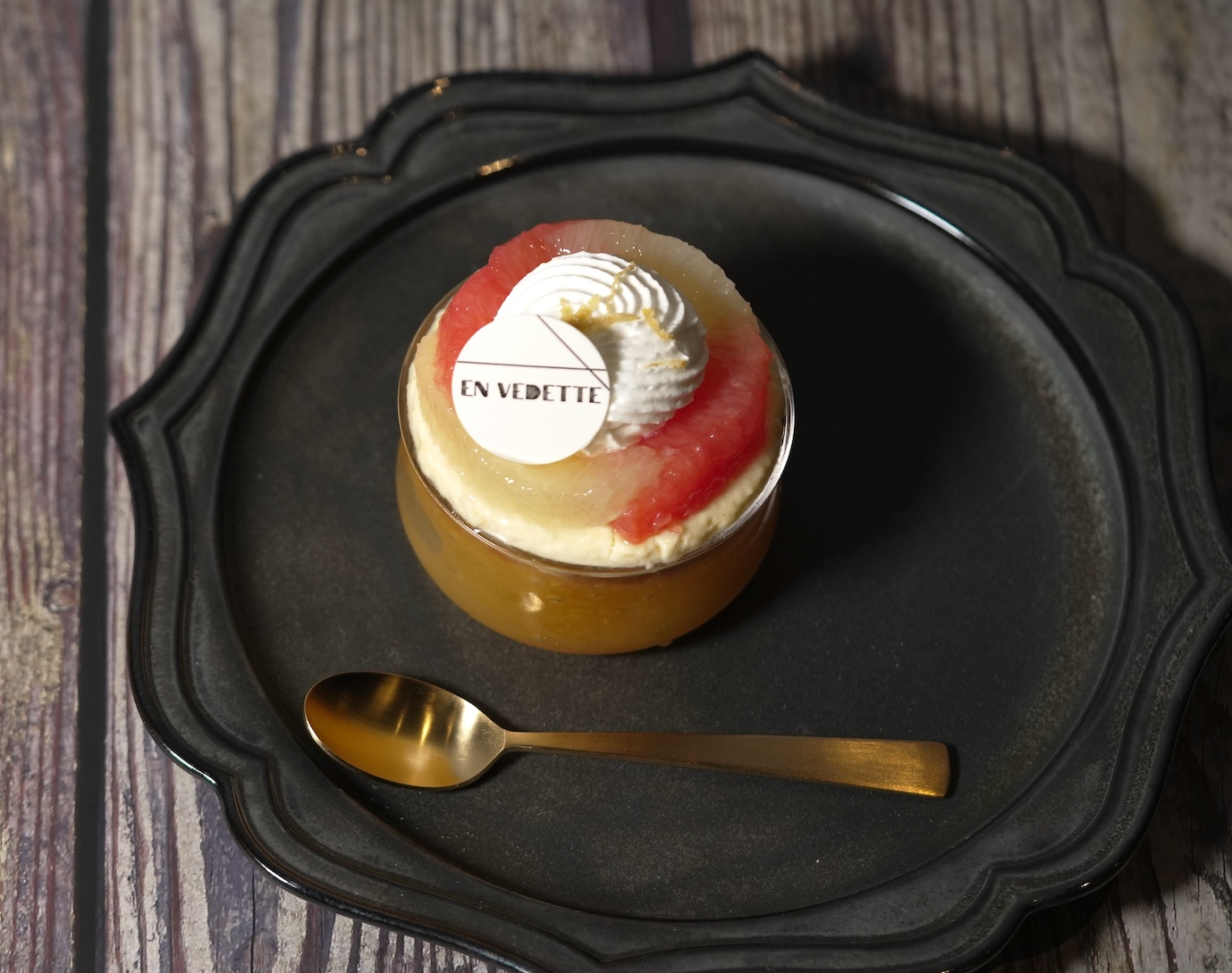 樹上で熟した甘く、香り高い愛知県蒲郡産の樹熟デコポンを贅沢に味わえるサヴァラン。甘い実はジュレに、皮は風味を残しながら自家製でコンフィに仕立てます。サヴァラン生地はこのコンフィを練り込んで焼き上げ、付け込むシロップにはコンフィを作るときにできたデコポンのエキスが詰まったシロップを使い、樹熟デコポンを余すところなく使用。できあがったサヴァランにはカスタードクリーム、デコポンのシロップとホワイトラムのアルコールで付け込んだサヴァラン生地、デコポンのジュレ、乳風味が豊かな北海道産の生クリームをのせました。
