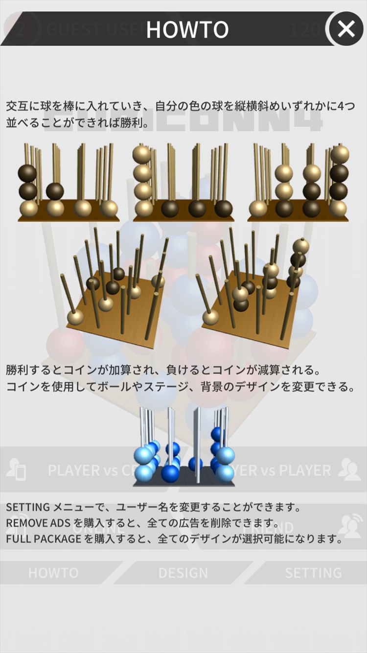 計16本のポールに色の違う2種類の球を交互に入れていき、縦横斜めいずれかに自分の色の球を4つ並べることを競うシンプルなゲームルール。