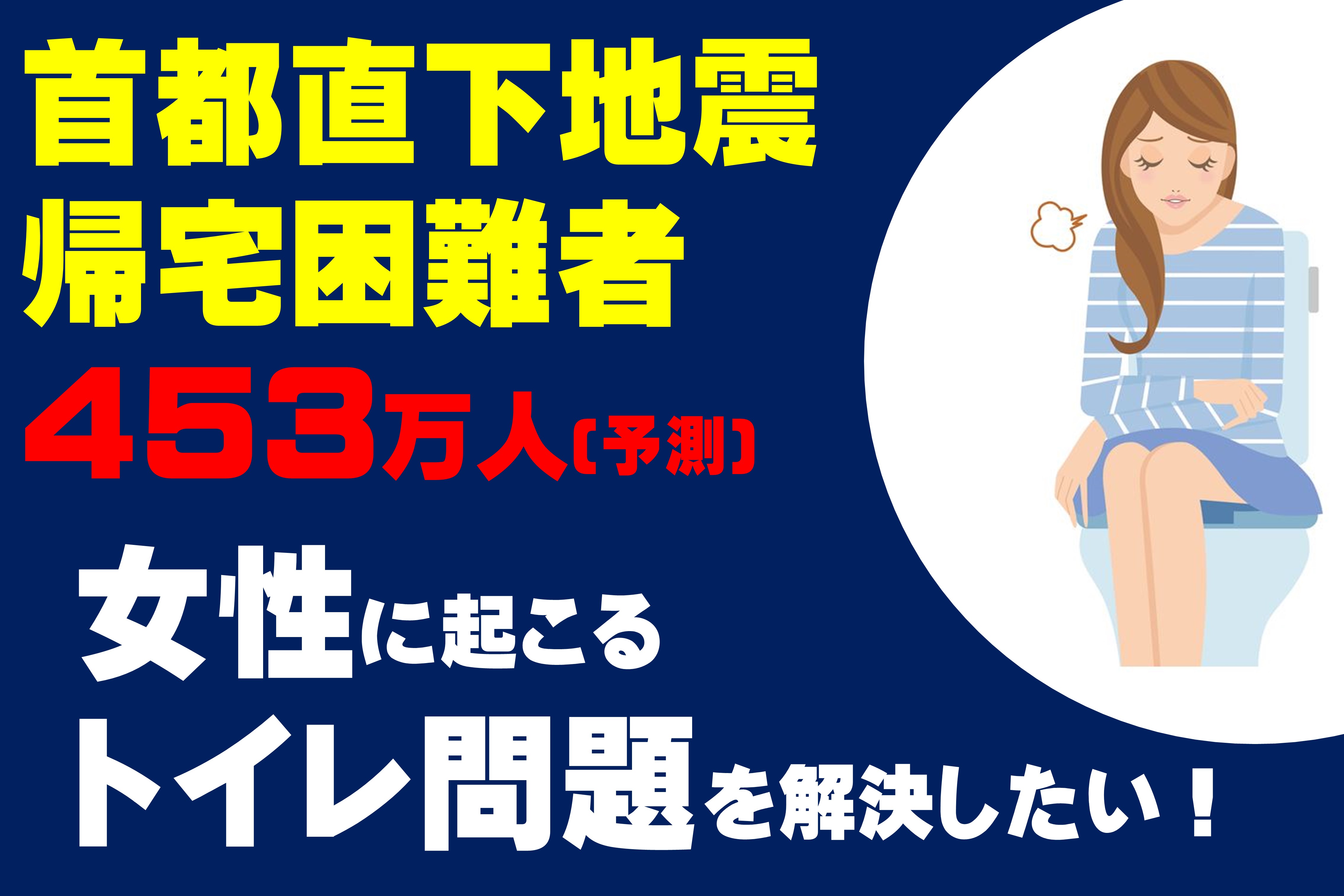 トイレは、電気、上水道、下水道のどれか1つでもストップすれば使えなくなり、水が流せない状態となります。 行政の資料によると各区役所が用意している災害用備蓄トイレはあくまでも住居している区民の分です。その区民の分さえも不足している所も多いのが現実です。当然、帰宅困難者(453万人)の為の用意はゼロに等しく、男性であれば緊急に屋外で用を足すこともできますが、女性は用を足す場所を失うことになります。