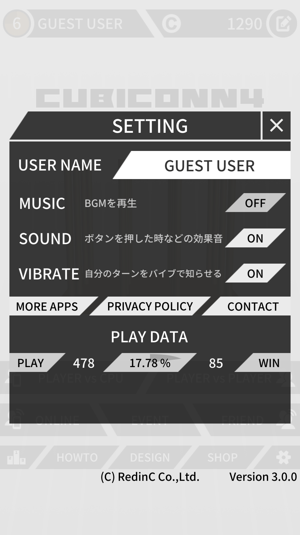 CUBICONN4には、CPU対戦や1台の端末で2人対戦するモードの他、オンライン対戦や随時開催されているイベントなども実装されており、2018年のリリース以来世界中で数多くプレイされている。