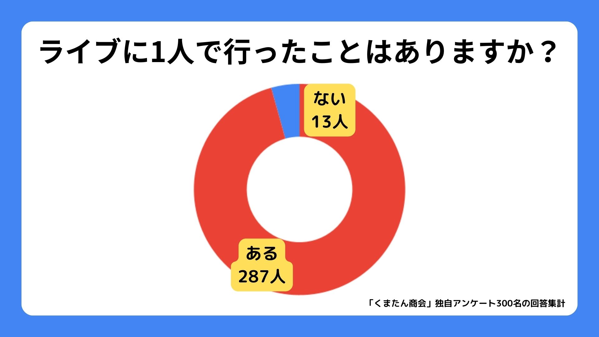 「くまたん商会」は、10代~50代の音楽ライブに行ったことがある方300人に、1人で音楽ライブに行ったことがあるか調査アンケートを実施いたしました。