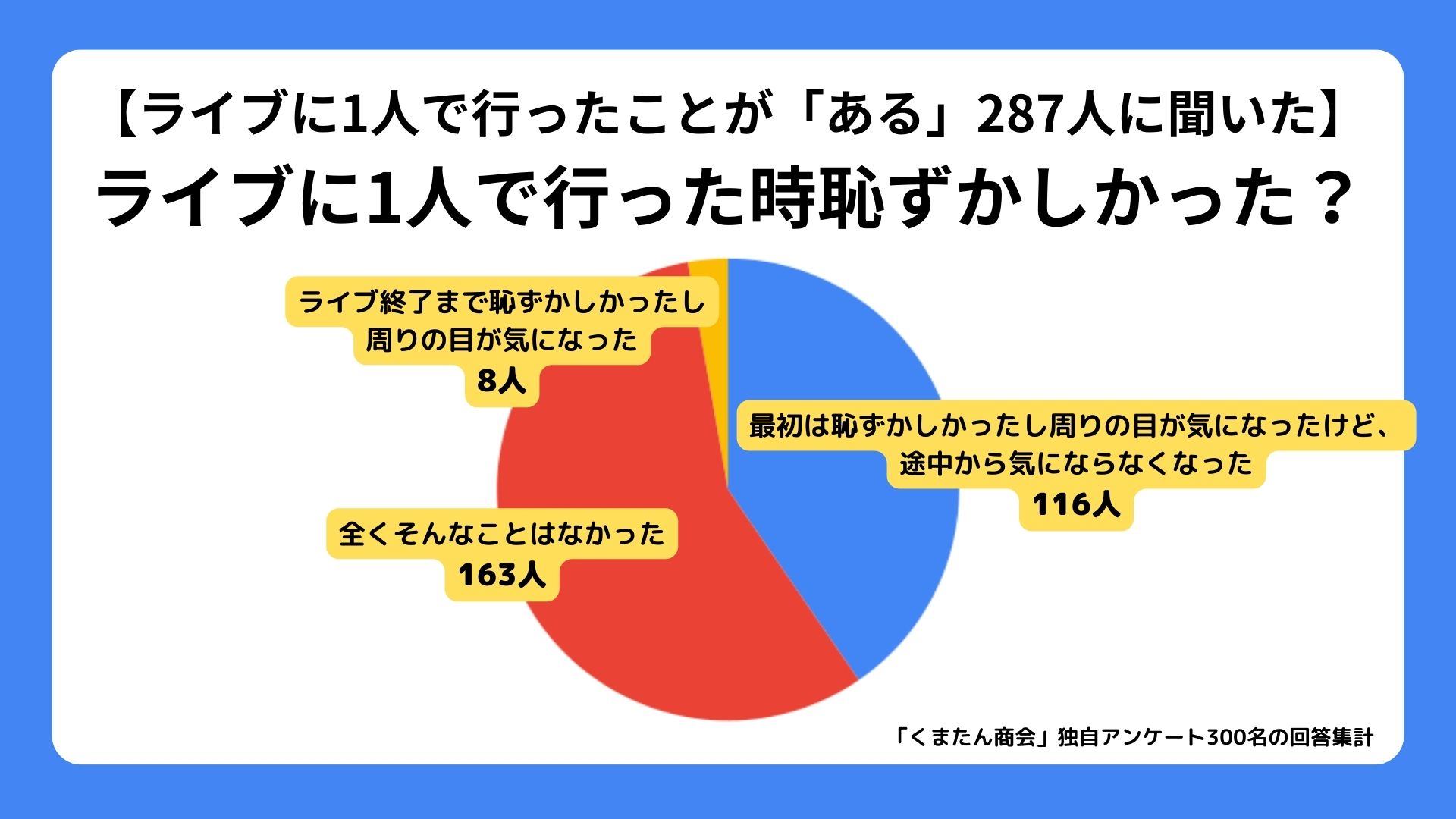 「くまたん商会」は、10代~50代の音楽ライブに行ったことがある方300人に、1人で音楽ライブに行ったことがあるかや、1人で行った時に恥ずかしかったり周りの目が気になったかなどの調査アンケートを実施いたしました。