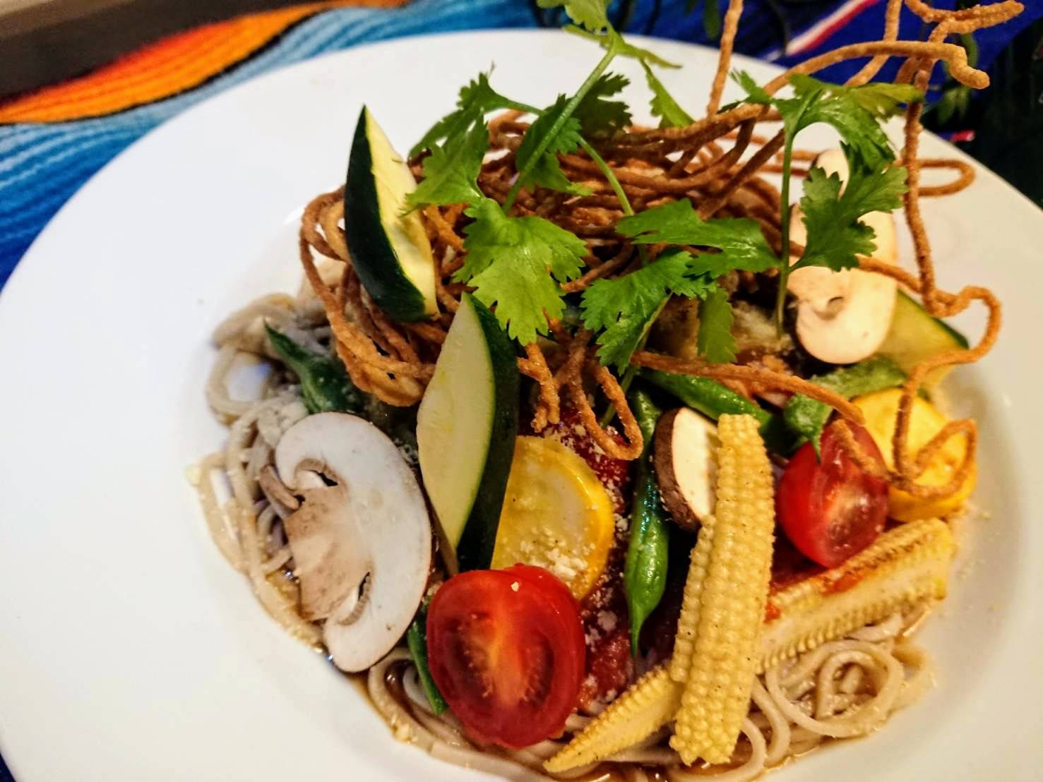 茹でたてつるつるの自家製蕎麦の上には、具だくさんのグリル野菜にガーリックをきかせたトマトソースをトッピング!カリカリの揚げ蕎麦やすりおろしたパルメザンチーズが良いアクセントです。