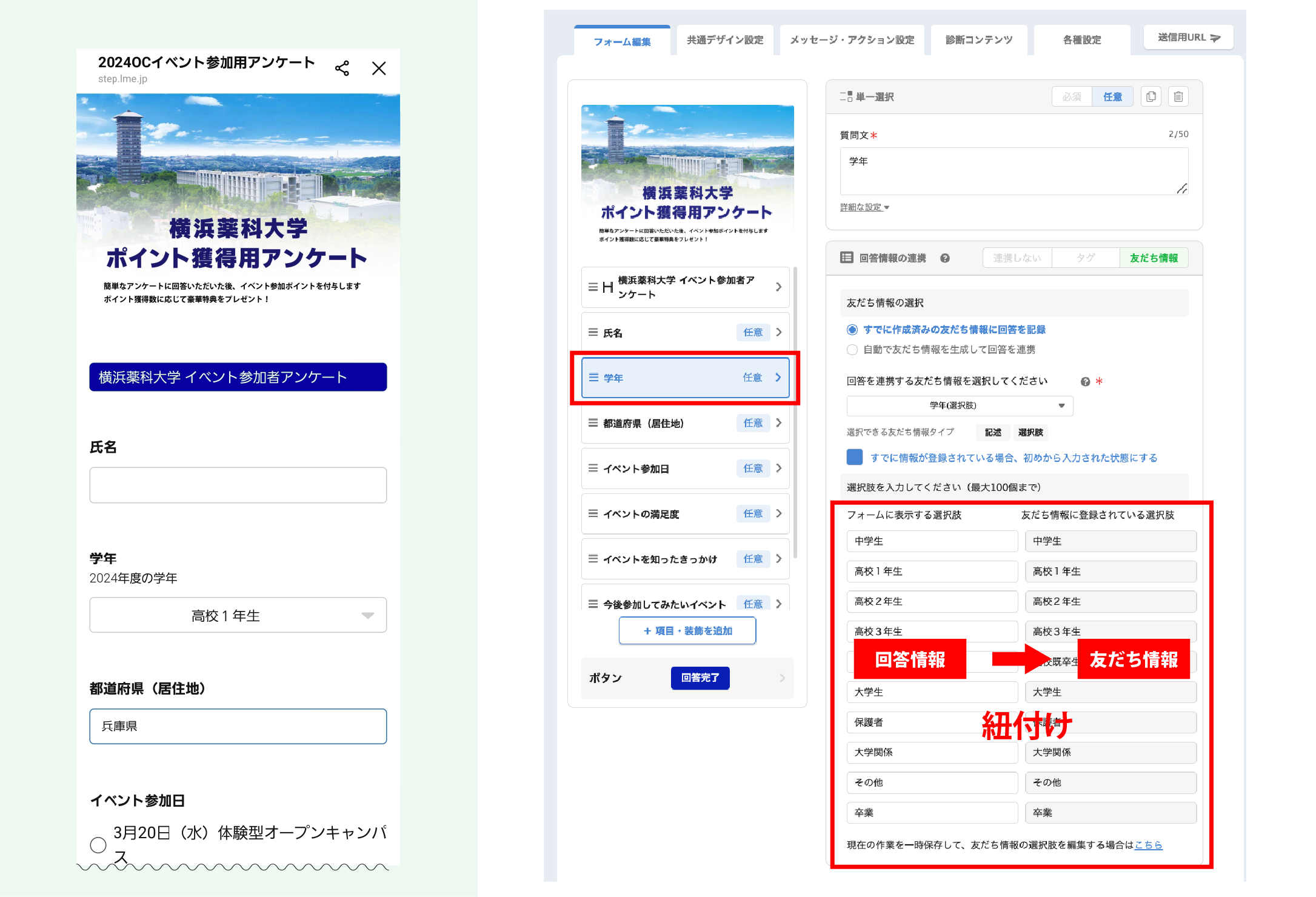 L Messageのフォーム作成機能を活用し、イベント参加者の「学年」「居住地」「参加日時」などをLINE上でスムーズに収集。