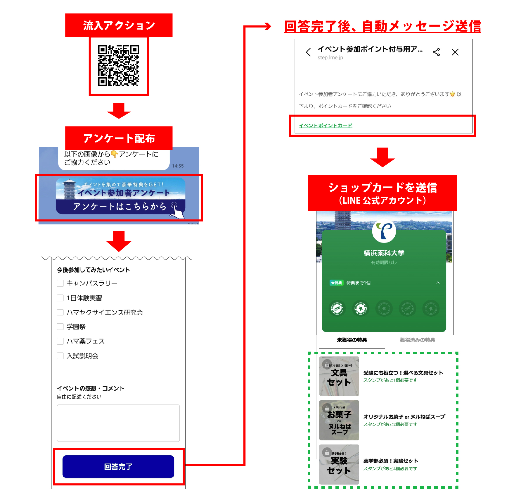 イベント専用QRを読み取り → 自動でアンケート配布&ショップカード送信