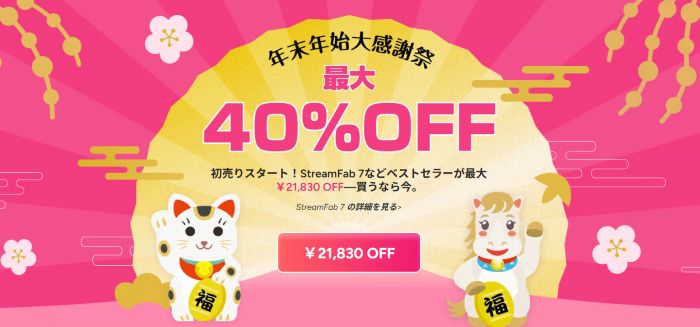 新年セールもいよいよラストスパート。StreamFabの主力製品「StreamFab オールインワン」は、キャンペーン期間中年間最安級(年度最低水準)の条件で提供されています。現在の最新価格は40,520円で、通常価格と比べて21,830円お得に購入可能です。