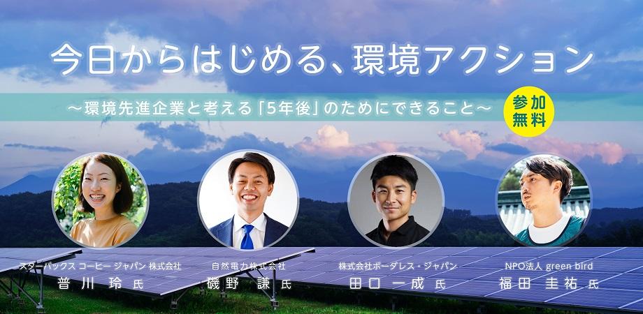 スターバックス/自然電力/ボーダレス・ジャパン/グリーンバードが登壇し、「ふつうの企業」ができる環境アクションについて議論します。