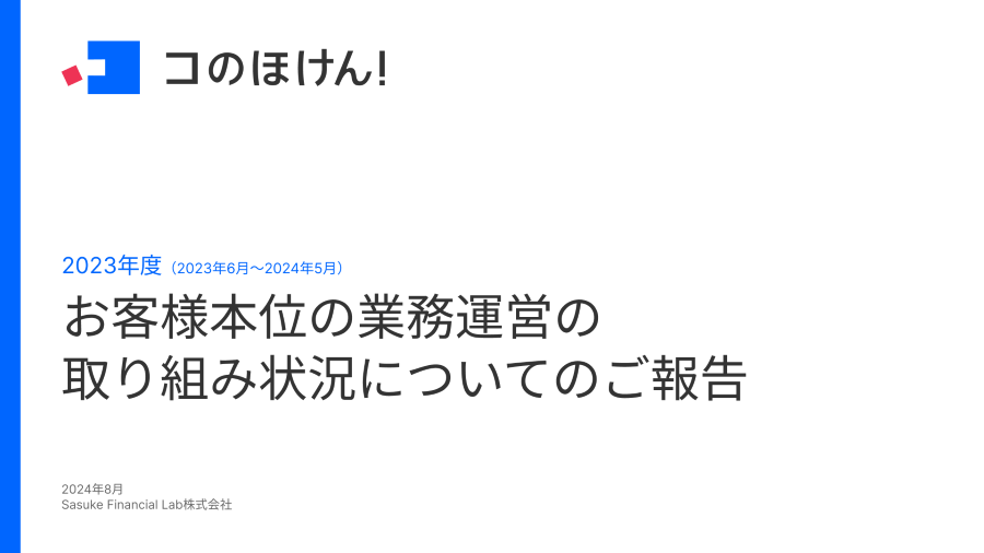 Sasuke Financial Lab株式会社(本社:東京都千代田区、代表取締役:松井清隆、以下「当社」)が運営する保険の一括比較・見積もりサイト「コのほけん!」(https://konohoken.com/)において「お客さま本位の業務運営方針」(以下、「FD宣言」)における2023年度の取り組み状況(KPI実績)を公表いたしました。