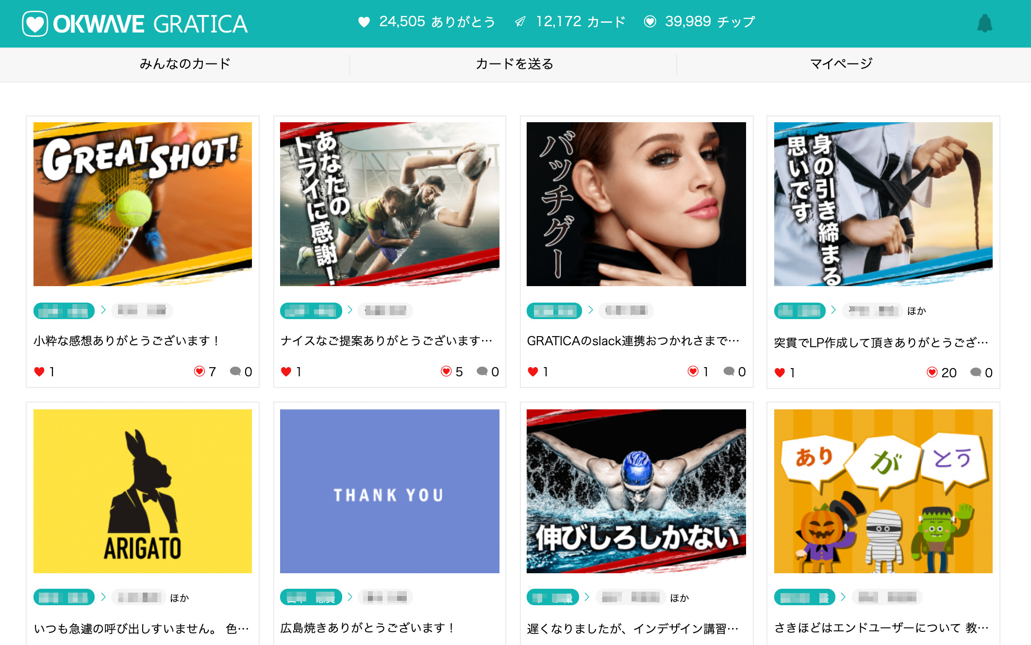 『OKWAVE GRATICA(オウケイウェイヴ グラティカ)』は、感謝の気持ちをデジタルグリーティングカードを通して伝え合うオンライン上のサンクスカードサービスです。誰がどんな内容の感謝を受けているかを可視化(数値化)できるため、従業員満足向上の施策として目標設定も容易です。普段の行いが感謝されることで従業員満足度向上(ES向上)に貢献できるほか、売上成績などとは別軸で、周囲から感謝されている人を評価できる“新しい評価軸”として導入することができます。