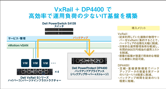 これらの課題を解決するために、耐障害性と拡張性が高いHCIのVxRailと、バックアップシステムDP4400を選定。VMware vSphereベースのVxRailであれば、従来のLinux/KVM環境のように頻繁なバージョンアップの手間はなく、ファームウェアなども、事前検証済みのアップデートプログラムが一括で提供されます。