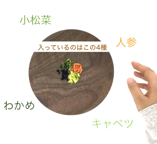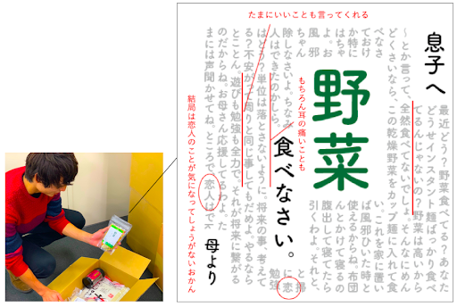 「手軽に食べられる乾燥野菜」というお題の下、skettchのメンバーが大学生ならではの視点で企画・開発いたしました。 本商品は、口にするのはカップラーメンばかりという一人暮らしの大学生の息子の 食生活を心配する母からの、野菜不足解消のための仕送りアイテムです。乾燥野菜をカップラーメンやみそ汁に加えるだけだから面倒くさがり屋の息子でも大丈夫、原材料は国産に限定されるので安全面でも安心、という優れものです。