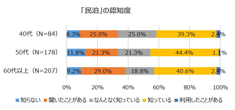 つぎに、「民泊を知っているか?」聞いてみました。『利用したことがある』(40代:2.4%、50代:1.1%、60代以上:2.4%)、『知っている』(40代:39.3%、50代:44.4%、60代以上:40.6%)、『なんとなく知っている』(40代:25.0%、50代:21.3%、60代以上:18.8%)、『聞いたことがある』(40代:25.0%、50代:21.3%、60代以上:29.0%)、『知らない』(40代:8.3%、50代:11.8%、60代以上:9.2%)となり、50代では『知らない』と回答した人が1割強いるものの、40代・60代以上では9割強の認知度があることがわかりました。