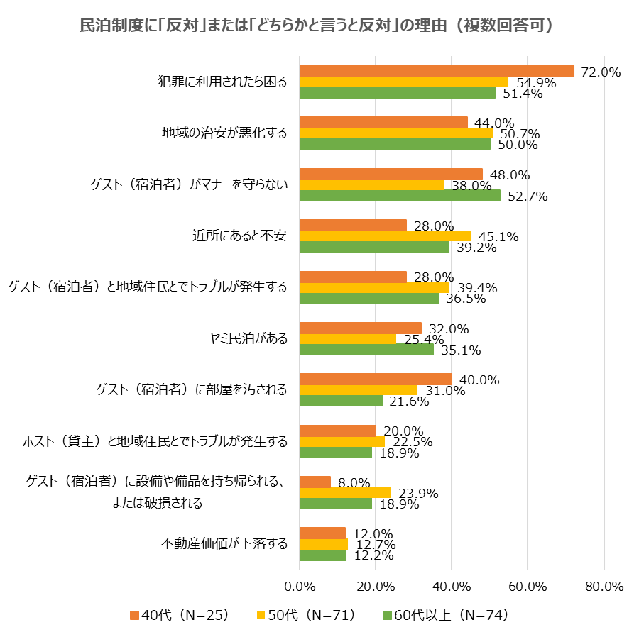 「反対」または「どちらかと言うと反対」と回答した人にその理由を聞きました。40代・50代で最も多かった回答は『犯罪に利用されたら困る』(40代:72.0%、50代:54.9%、60代以上:51.4%)で、60代以上では『ゲスト(宿泊者)がマナーを守らない』(40代:48.0%、50代:38.0%、60代以上:52.7%)となりました。