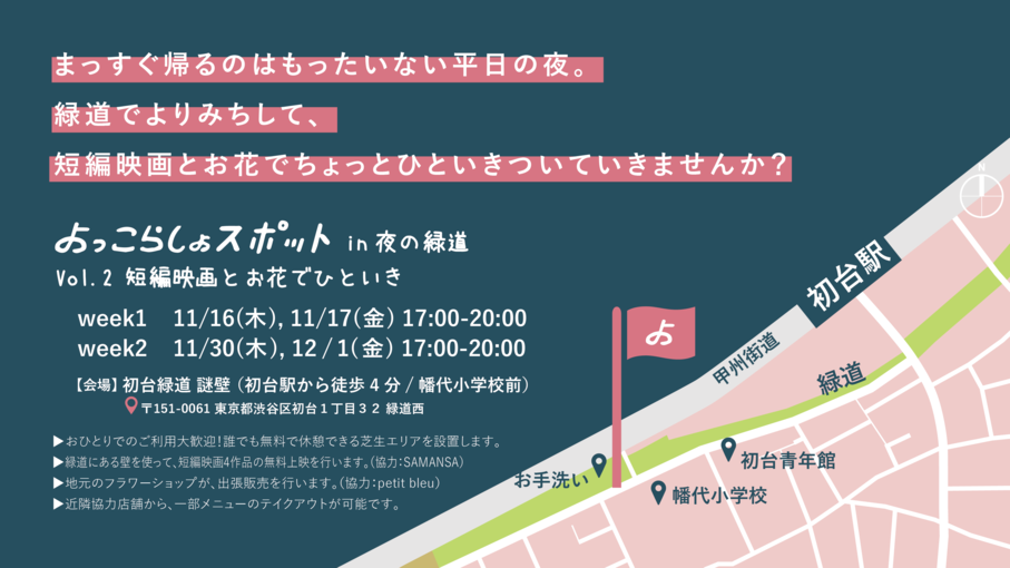 11/16(木)~17(金)と11/30(木)~12/1(金)の計4日間、渋谷/初台緑道のイベント「よっこらしょスポットin夜の緑道」にてSAMANSAのショート映画を上映いたします。