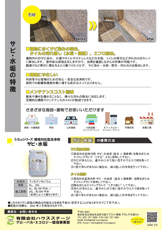 カビ取り/カビ対策/カビ取り剤など環境でサスティナブル社会に貢献する有限会社ハウスステージ グローバル・エコロジー環境事業部は、製剤での劇物にあたる成分不使用業務用洗浄剤G-Ecoシリーズ「環境対応型洗浄剤サビ・水垢」を発売しました。