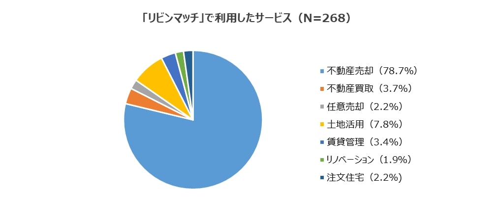 「当サイトで利用したサービス」をたずねたところ、『不動産売却』(78.7%)、『不動産買取』(3.7%)、『任意売却』(2.2%)、『土地活用』(7.8%)、『賃貸管理』(3.4%)、『リノベーション』(1.9%)、『注文住宅』(2.2%)となりました。