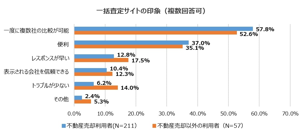 つづいて、当サイトのような「一括査定サイトはどのような印象なのか?」聞いてみました。最も多かった回答は『一度に複数社の比較が可能』(不動産売却利用者:57.8%、不動産売却以外の利用者:52.6%)、以下『便利』(売却:37.0%、売却以外:35.1%)、『レスポンスが早い』(売却:12.8%、売却以外:17.5%)、『表示される会社を信頼できる』(売却:10.4%、売却以外:12.3%)、『トラブルが少ない』(売却:6.2%、売却以外:14.0%)となり、一括査定サイトの強みを理解して利用している人が多いことがわかりました。