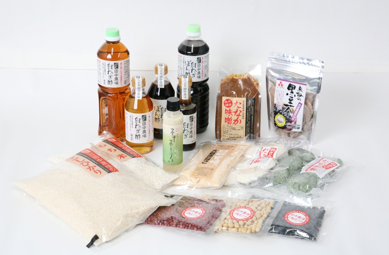 田中農場では、自社農場で栽培した作物を原材料にした、酢、ドレッシング、味噌、きな粉、お茶などの加工品の開発・販売を行ってきました。素材の品質や安全性、製造方法に徹底的にこだわる企業とともに商品開発を行い、化学調味料や余計な添加物は入れずに作り上げました。