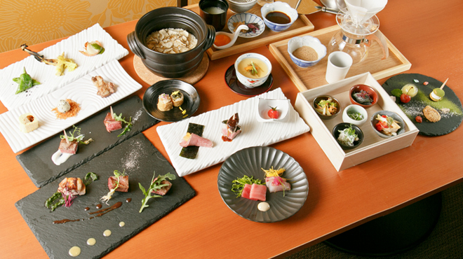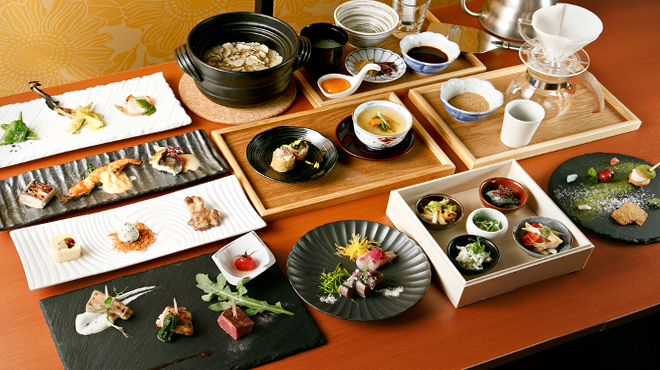 当店は、フランス修行経験のあるシェフと和食一筋25年の料理人が創作する炭火焼フュージョン和食のお店。旬の魚介と野菜を中心に、ジビエや高級黒毛和牛の炭火焼までをご用意したコース中心で、名物〆の「トリュフ土鍋ご飯」は至福のひと時を演出いたします。