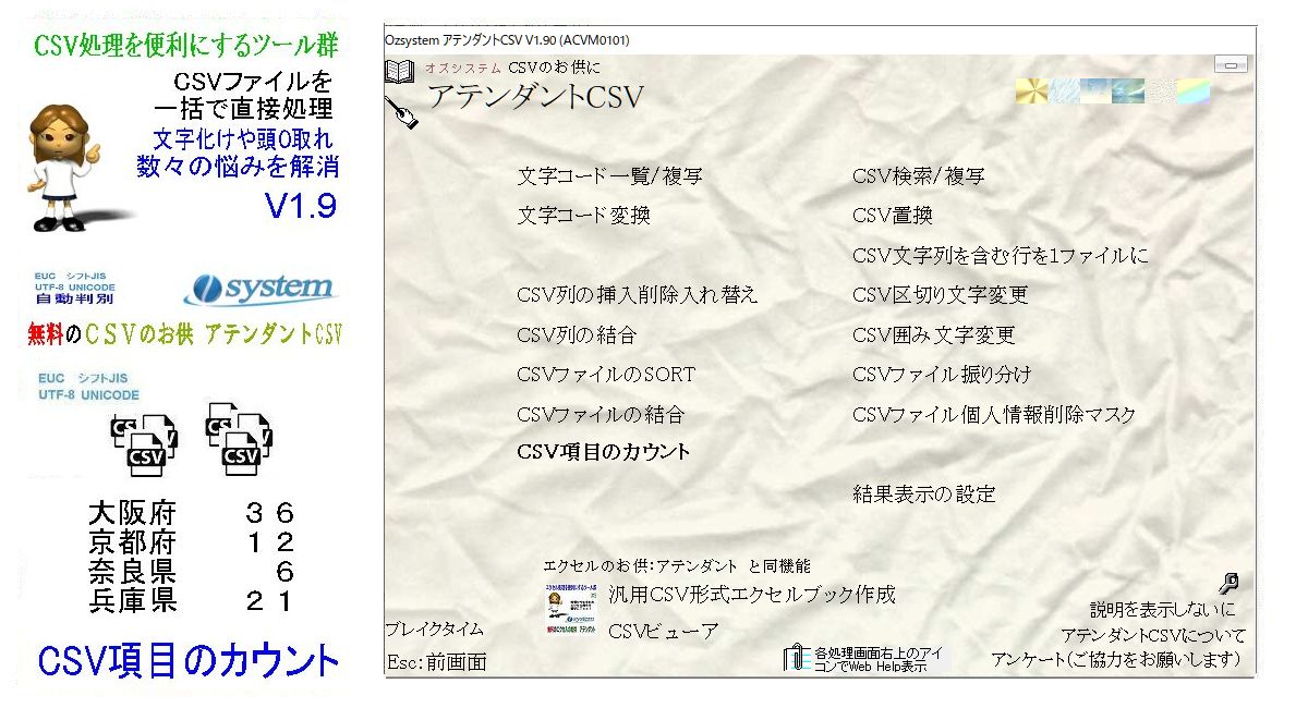 CSV処理をより便利にする無料ツール集「CSVのお供 アテンダントCSV」をバージョンアップ。いくつかのCSVファイルの項目をカウントします。 例えば、受注データから都道府県別のカウントを行ったり、お客様別のカウントを算出する事ができます。