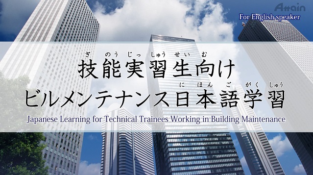 「技能実習生向けビルメンテナンス日本語学習(別名:技能実習生向けビルクリーニング日本語学習)」はビルクリーニング外国人技能実習生を対象に開発した日本語を学習する動画教材です。学習者の一般的学習能力を配慮して、学びやすく、習得を確実にする「ゆるやかな教材」となっています。この教材ではビルクリーニング業界でよく使用する語彙・文法・主要表現など必要な基本的知識を映像で解説します。その内容を定着させるための練習も付きます。また、実際の会話の中に、ビルクリーニングの語彙と文法が応用されているので、ビルクリーニングの仕事に役に立つとともに、日本語でのコミュニケーション能力を向上させます。漢字に馴染みが無い国の方でも勉強ができるように、すべての漢字の上に、ひらがなのルビが付いています。初級日本語学習者に向け、ナレーションにすべて英語字幕を表示しています。例文と練習の部分はローマ字がフォローアップしています。外国人学習者の気軽に勉強できる教材となります。さらに、各課に学習テキストがPDFで付属し、印刷して予習や復習にご利用できます。