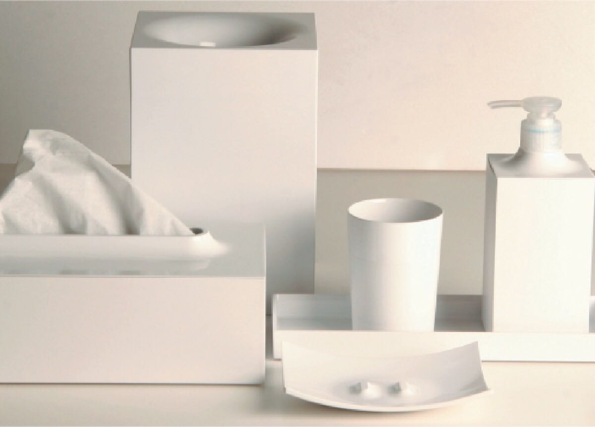 6つの洗面用品。プラスチックでも安っぽくない、陶器のような質感を目指し開発されました。クリアな質感と手になじむやさしい素材感との組み合せが新鮮な、飽きのこないデザイン。普段の暮らしの中にアクセントを添えてくれます。