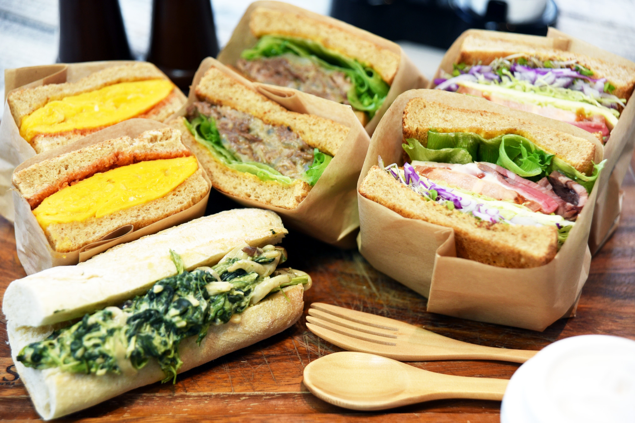 ひとつひとつお店で丁寧に仕上げるボリューム満点のアメリカンサンドとイタリアで日常的に食べられているほうれん草と4種のキノコと細かく刻んだベーコンを合わせた定番のスピナッチ、日本生まれの厚焼き玉子をサンドした分厚いタマゴサンドをご用意いたしました。