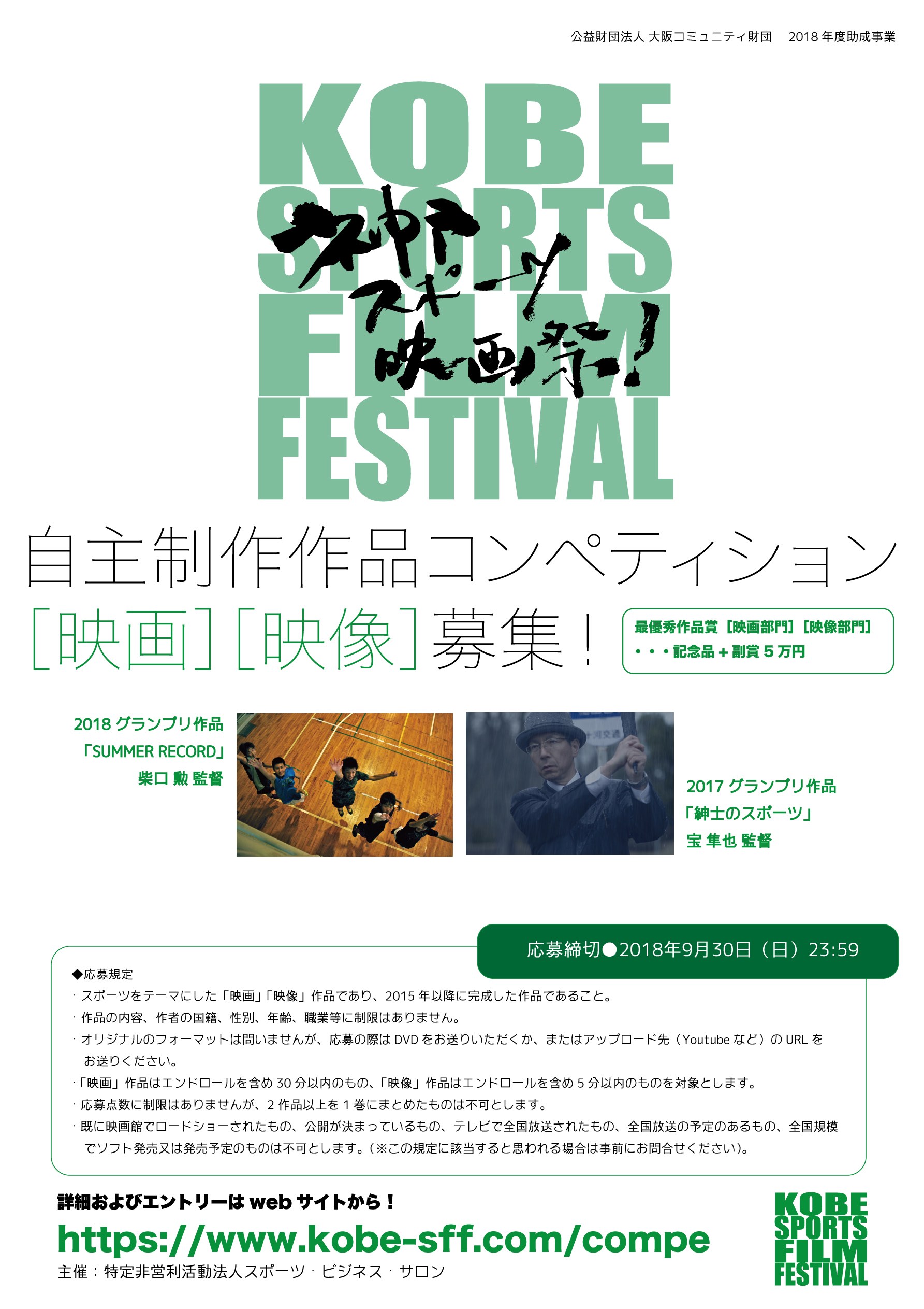 NPO法人スポーツ・ビジネス・サロンでは、今年度も「【神戸スポーツ映画祭!】自主制作作品コンペティション」を開催いたします。スポーツをテーマにした映画作品に加え、今年度から5分以内の「映像部門」も新設。スポーツ映画のカテゴリーで新たな名作、才能の発掘に貢献していきたいと考えています。
