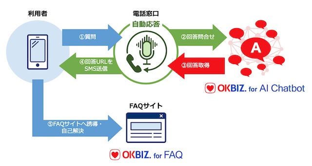このたび提供を開始した「VOICE to WEB」は、電話サポート窓口などに備えられた自動音声応答システムと連携し、顧客からのお問い合わせの音声通話に、AIがSMS送信にて自動回答を行う「OKBIZ. for AI Chatbot」(※2)の連携オプションです。