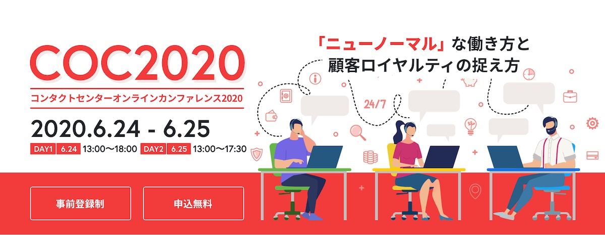 『COC2020』はコンタクトセンターの管理者や業務従事者を対象としたオンラインにて実施する無料のカンファレンス・イベントです。新型コロナウイルス感染拡大により、企業内においては従来の常識にとらわれない働き方への移行が否応なく進められる中で、コンタクトセンターにおける“withコロナ”時代の「ニューノーマル」な働き方とは何か、そして「ニューノーマル」な働き方の中で顧客ロイヤルティを維持・向上するために今後コンタクトセンターはどのような役割を担っていけば良いのかを2日間に渡って主催者らのセッションを通じて考えます。