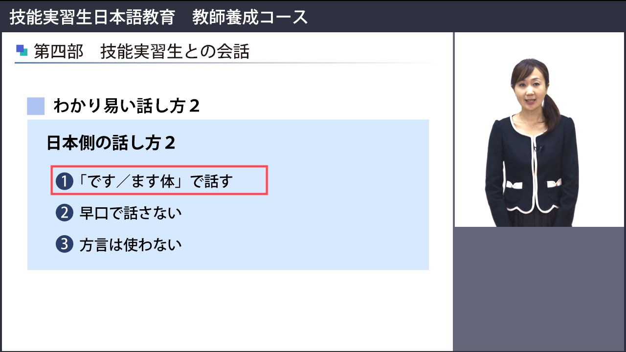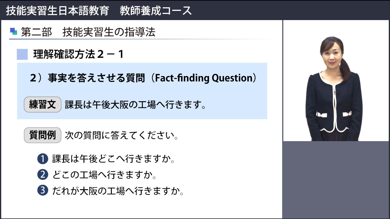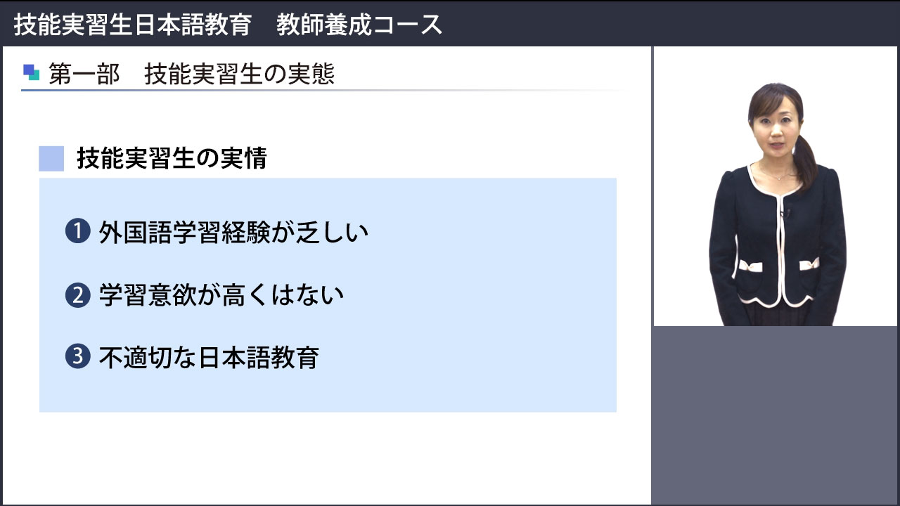 本教材は、技能実習生の日本語教育を担当する教師のための養成コースです。技能実習生の日本語学習者は、学習環境、学習意欲、学習能力などが留学生とは全く異なるため、それらを充分に理解して教育に当たる必要があります。