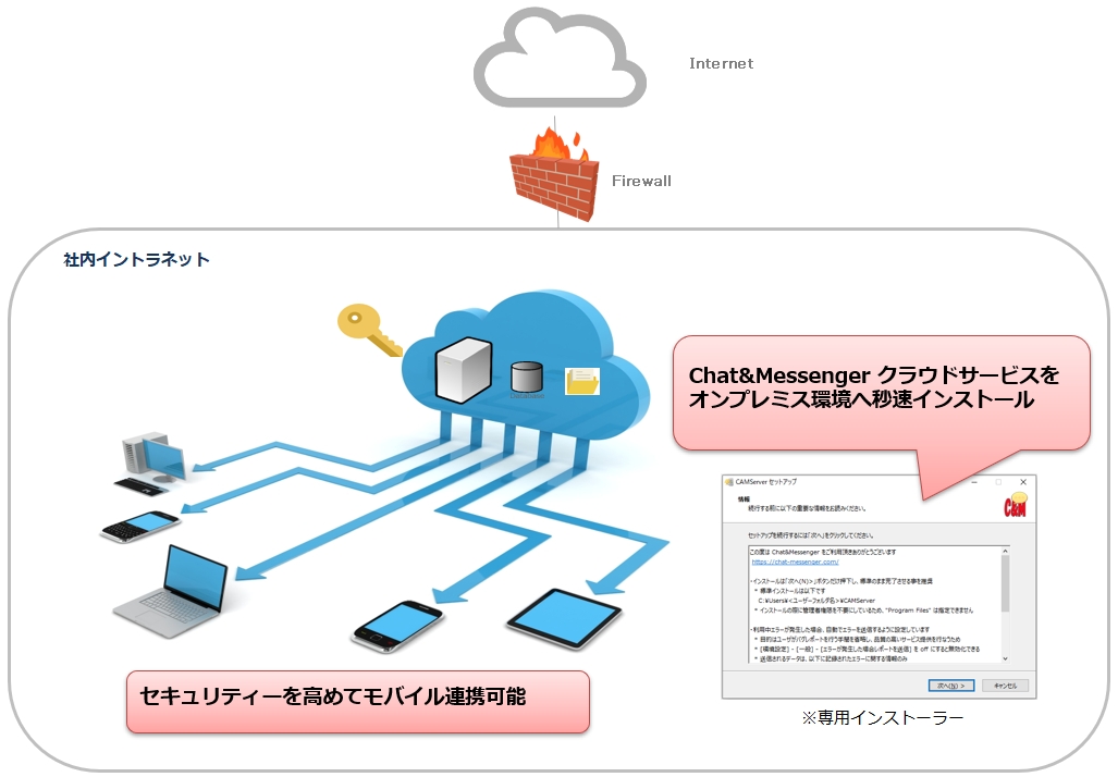 これまで開発してきた Chat&Messenger クラウドサービスを、自社内オンプレミス環境へ簡単に構築できるようになりました。これによりオンプレミス環境でもモバイル連携が可能です。