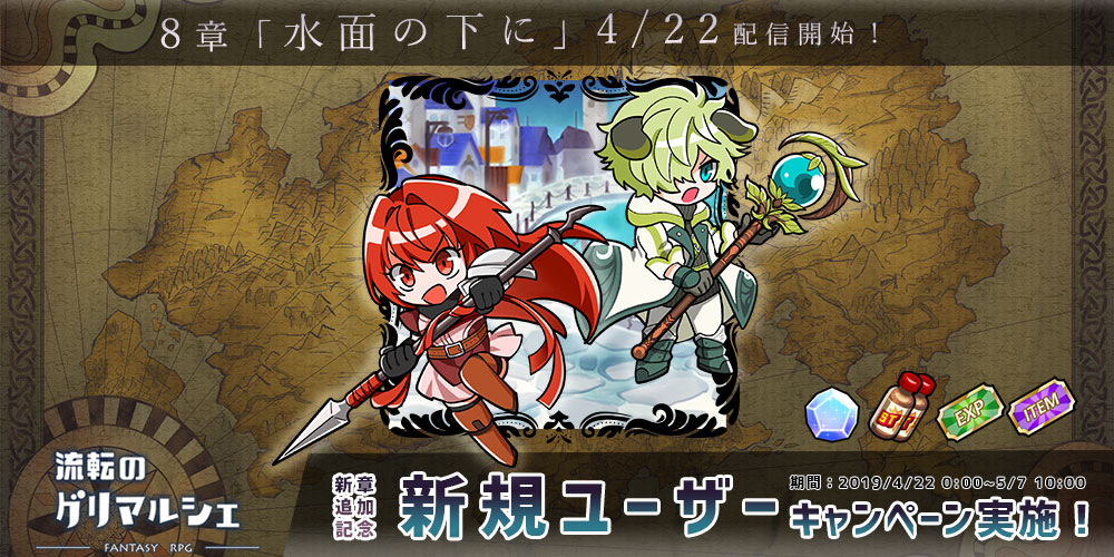 株式会社アットステージ(本社:東京都中央区、代表取締役:村上茂樹)は、スマホゲーム“キャラクタークリエイトRPG”『流転のグリマルシェ』において、2019年4月22日(月)より、メインストーリー新章「第8章 水面の下 ~ 水没したルセルトリ ~」の配信を記念した新章追加キャンペーンを開催いたします。
