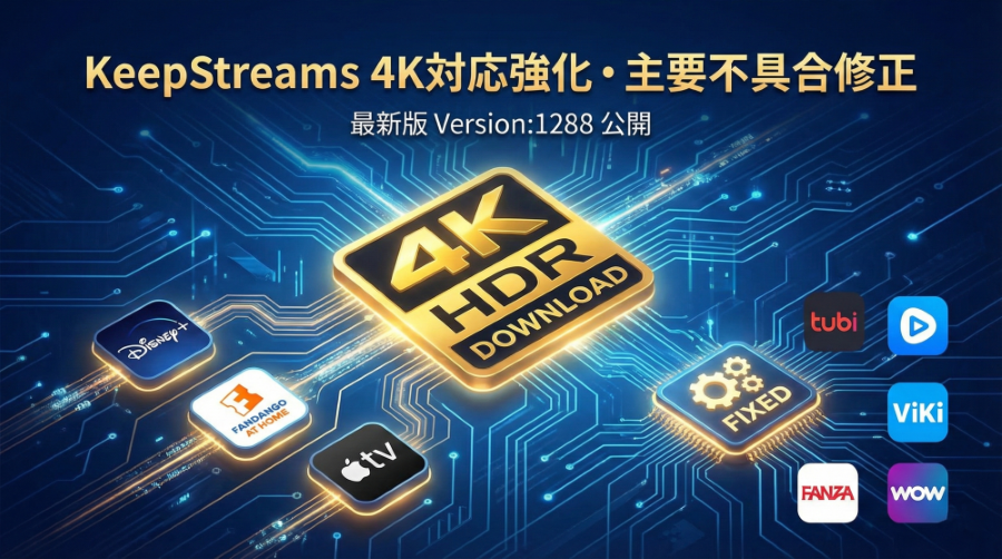 ストリーミング動画ダウンローダー「KeepStreams」は、最新版Version:1288を公開し、Disney+、Fandango at Home、Apple TV向けの4K HDRダウンロード機能追加と、Tubi/Viki/FANZA/WOWなど主要サービスにおける不具合修正を行いました。