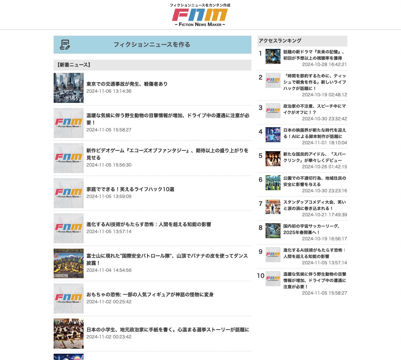 『フィクションニュースメーカー(FNM)』は、ユーザーがいくつかの選択肢を選びAIがフィクションニュースを生成するウェブサイト。