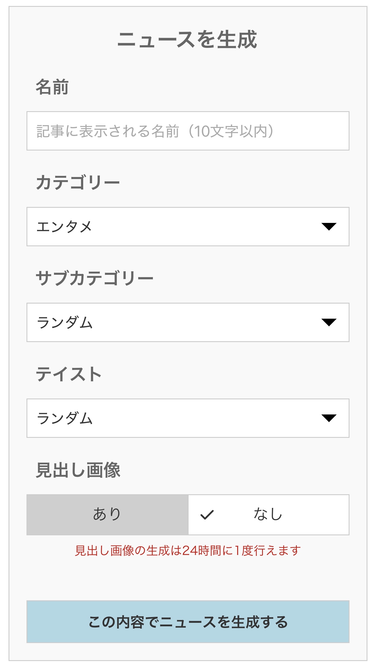 ニュース生成画面では、ユーザー名を入力し、それぞれの選択肢を選ぶことで生成するニュースの内容を決めることができます。
