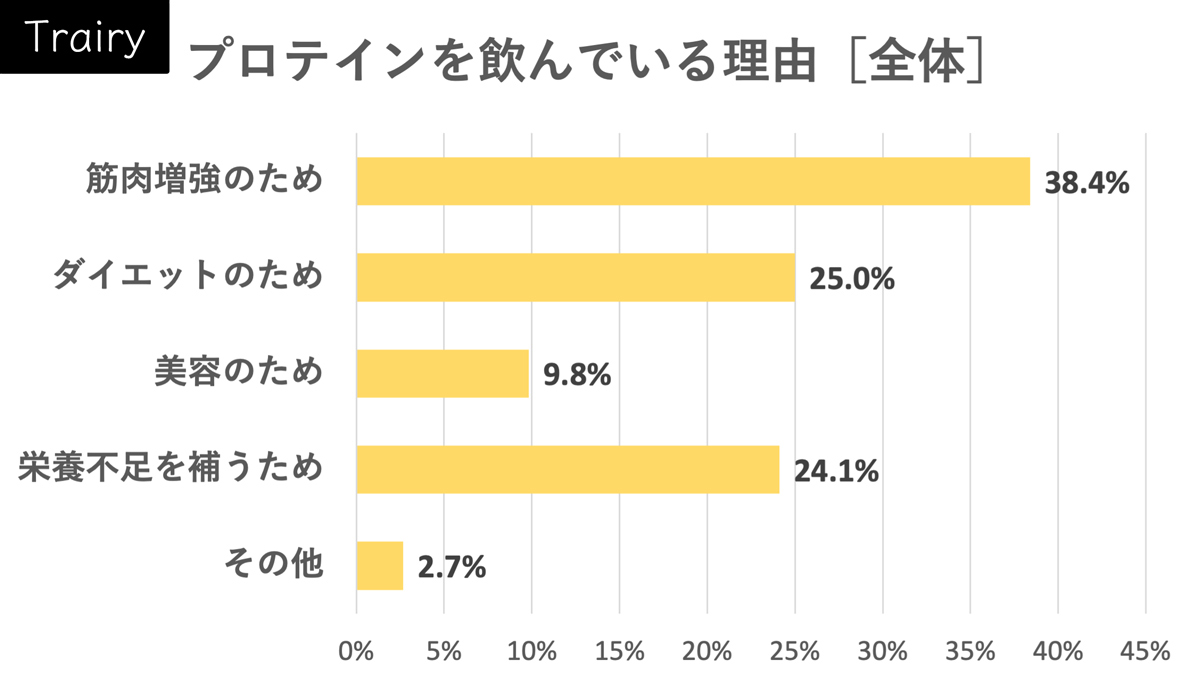 トレーニング情報メディア「Trairy[トレーリー]」では、2023年5月18〜22日にプロテインの摂取理由について、プロテインを飲んでいる男女112人にアンケートを行いました。