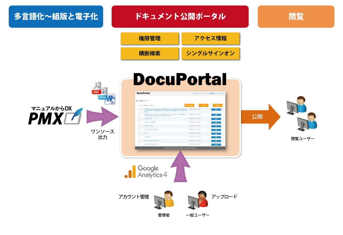 今回リリースした、ドキュメント公開ポータルシステム「DocuPortal」は、マニュアルをはじめとするドキュメントや、画像などの様々なコンテンツを権限に応じて公開するためのポータルサイトを開設することができる製品です。国産製品であるため、国内ユーザーの声を素早く製品に反映させつつ、ユーザーは手厚いサポートを受ける事が可能です。また、サイバーテックが提供するマニュアル作成支援システム「PMX」との直接連携も可能であるため、HTML・PDF・MS Wordといった様々な形式でワンソース出力されたマニュアルや、多言語マニュアルを直接アップロードすることが可能となります。