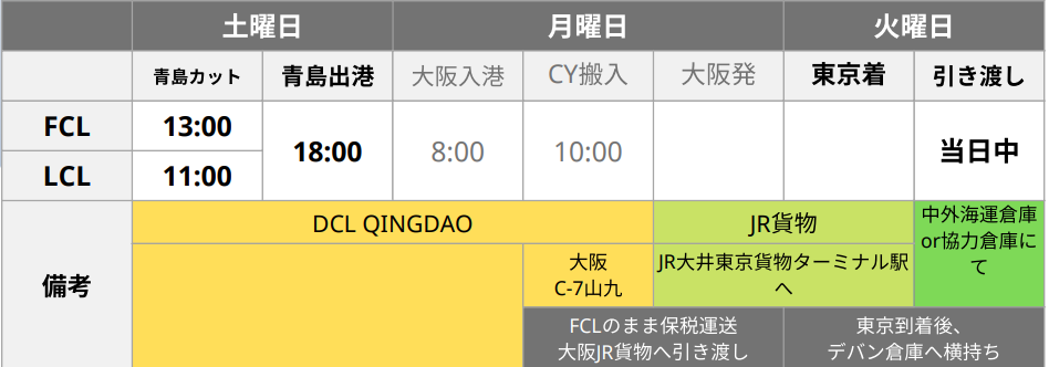青島の荷受けカットは、出港当日土曜日(LCLは午前11時、FCLは午後13時)