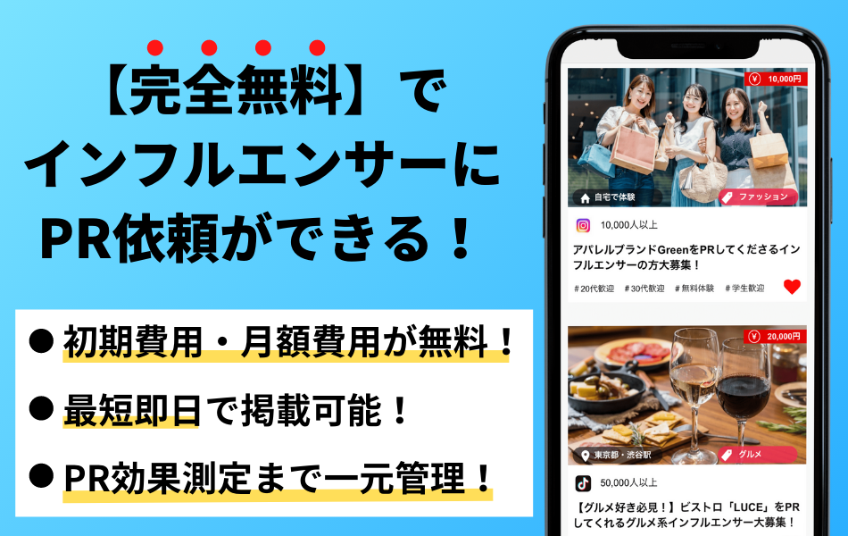 最短即日で人気インフルエンサーに0円からPR依頼ができます。