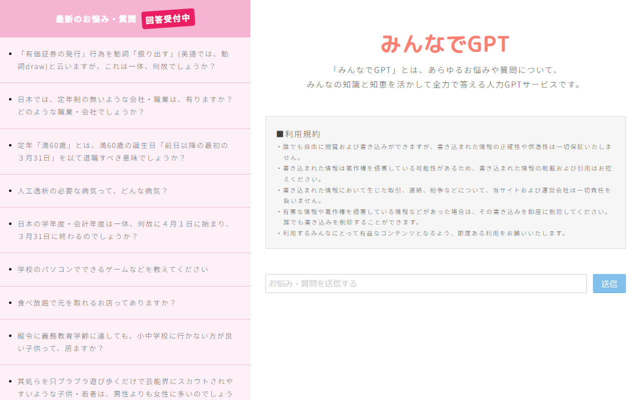 ChatGPTなどのAI生成技術の進展に伴い、AIには欠けている人間の知識と知恵、経験を活かした、より魅力的なサービスとして「みんなでGPT」を立ち上げました。
