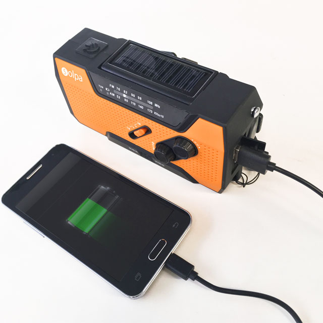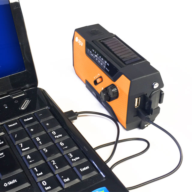 ハンドルを回す「手回し充電」、本体に搭載したソーラーパネルで太陽光を電力に変換する 「ソーラー充電」。さらに付属のUSBケーブルをつなげればパソコンや家庭用コンセントから も充電できます。