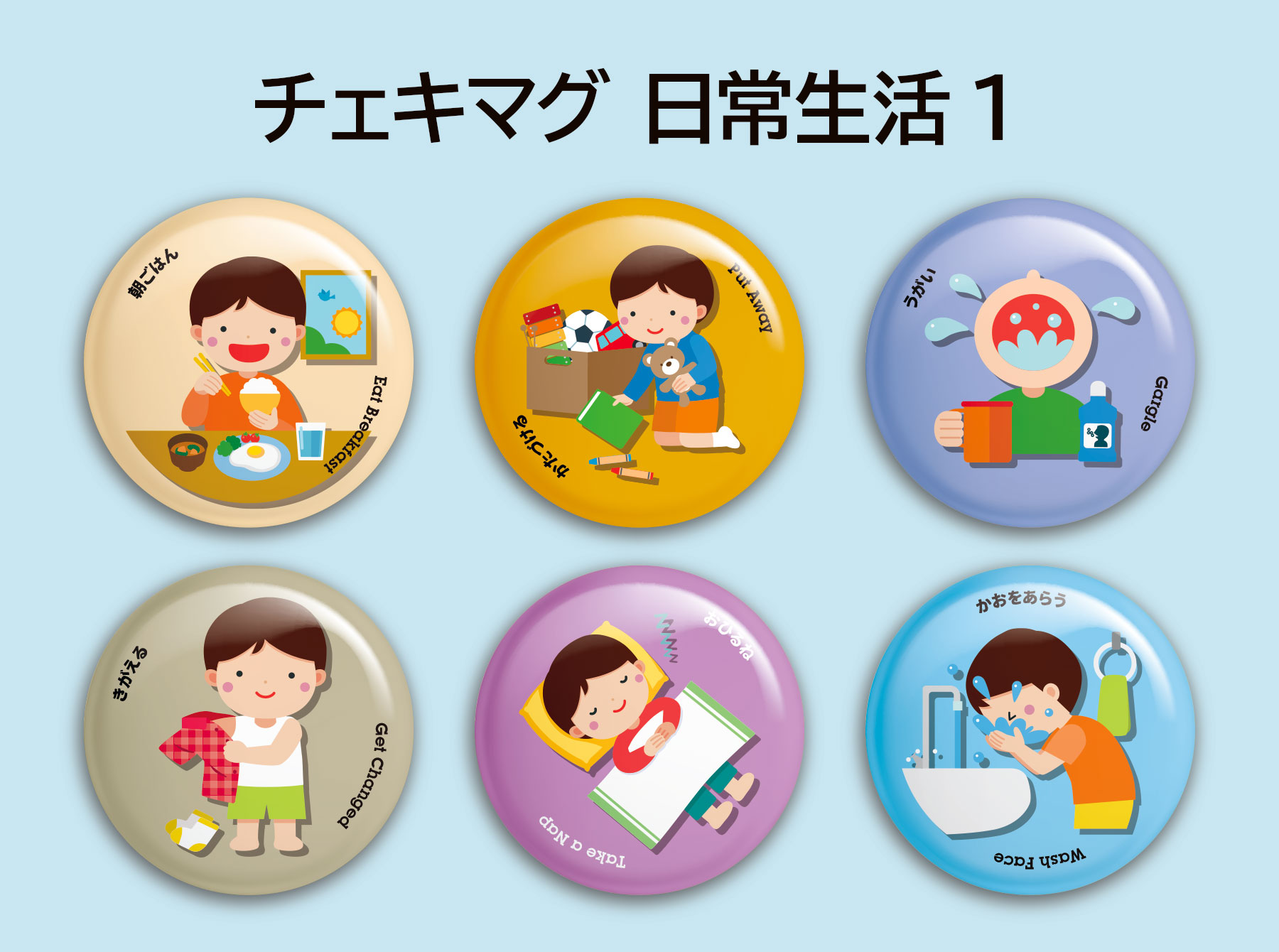 この度、発達障がいをお持ちのお子様のお母様から、日常生活のトレーニング用として、食事や着替え、歯磨きなど、日々の行動をイメージしたチェキマグを作ってほしいというご要望をいただきました。