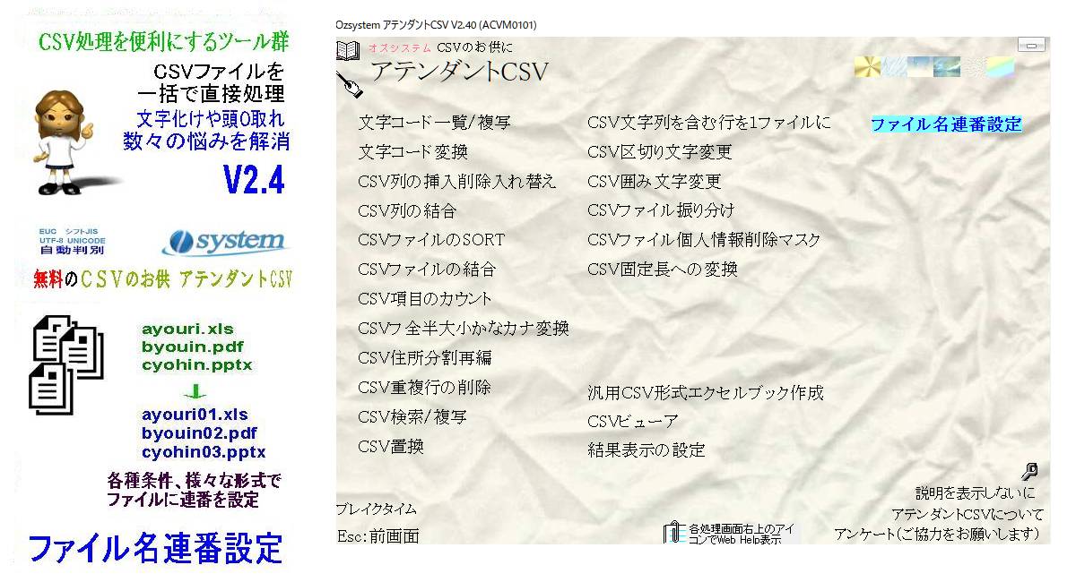 CSV処理をより便利にする無料ツール集「CSVのお供 アテンダントCSV」をバージョンアップ。ファイル名連番設定を追加