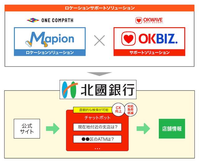 地図検索サービス「マピオン」を運営する、凸版印刷株式会社のグループ会社である株式会社ONE COMPATH(ワン・コンパス、本社:東京都港区、代表取締役社長CEO:早川 礼、以下ONE COMPATH、※1)と、Q&Aサイト「OKWAVE」(https://okwave.jp)の運営ならびにFAQシステム等を提供する株式会社オウケイウェイヴ(本社:東京都港区、代表取締役社長:松田 元、以下オウケイウェイヴ)は、2019年11月に発表した通り店舗検索サービスとAIチャットボットの連携による協業を開始し、この度、北國銀行に向けて初めてサービス提供を開始しました。