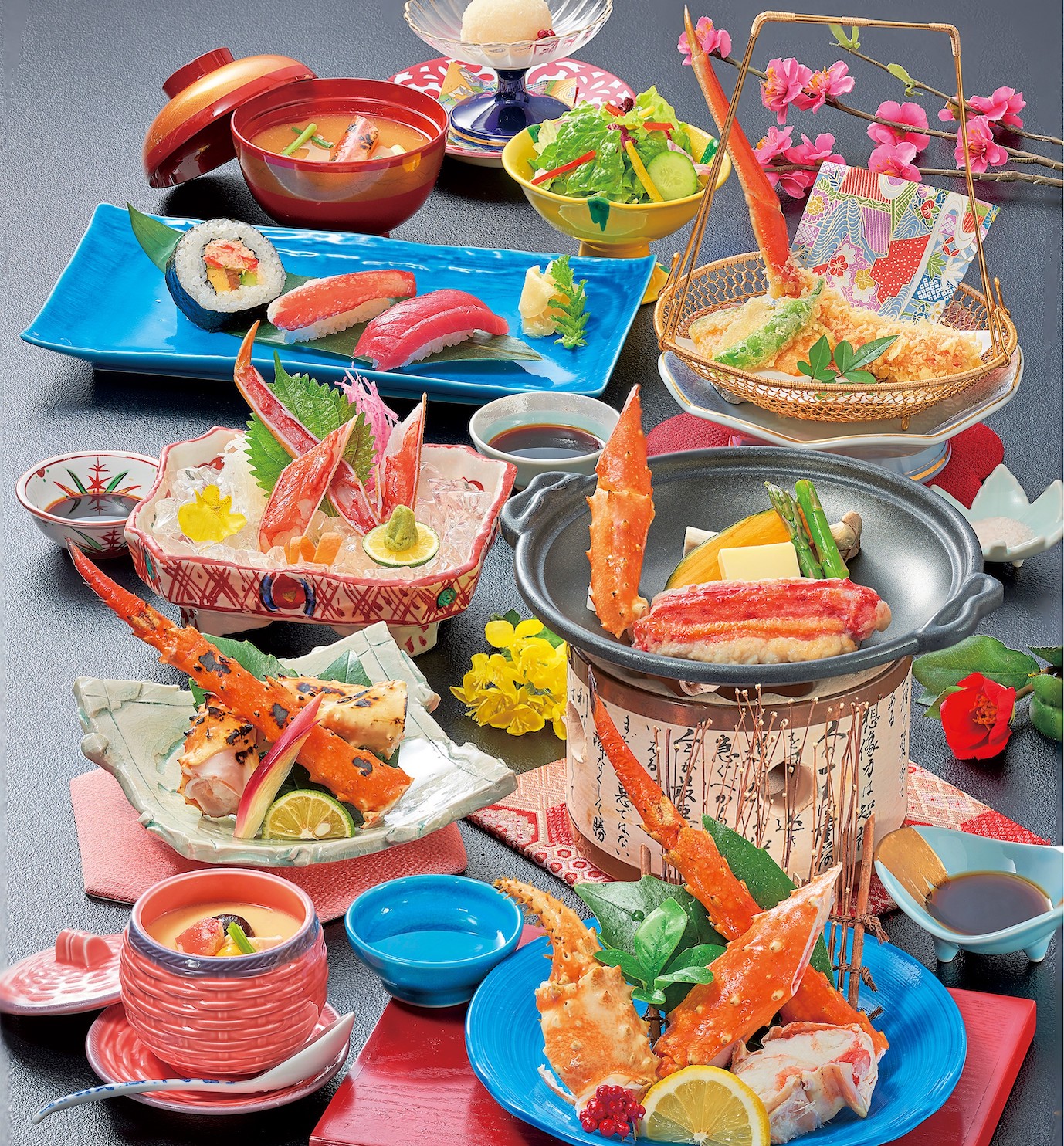 テーキ・いばら焼き・かに茶碗蒸し・かに天ぷら・寿司・