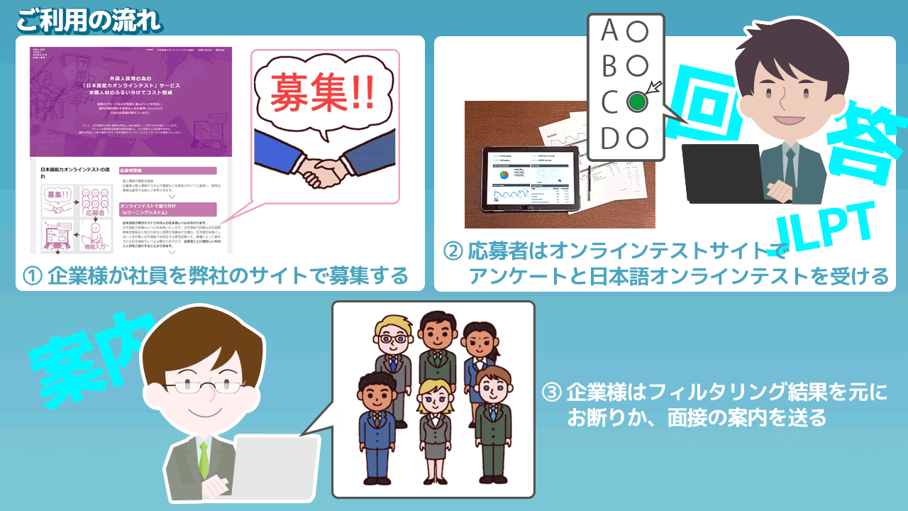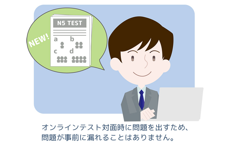 日本語能力試験は国際交流基金で年に2回行われていますが、弊社のオンラインテストサービスは随時受けるようになっています。労働力が不足している現状、常に外国人労働者の受け入れる体制が必要です。それに伴い、弊社のサービスは随時日本語力のテストを行うことが可能です。外国人労働者の日本語能力を判断する上に、人手不足が深刻な建設、農業、介護分野などを対象に、適当な業種に人材を選抜することができます。オンラインテストの内容は弊社の独自のものであり、日本語能力試験レベルに合わせたテスト内容となります。