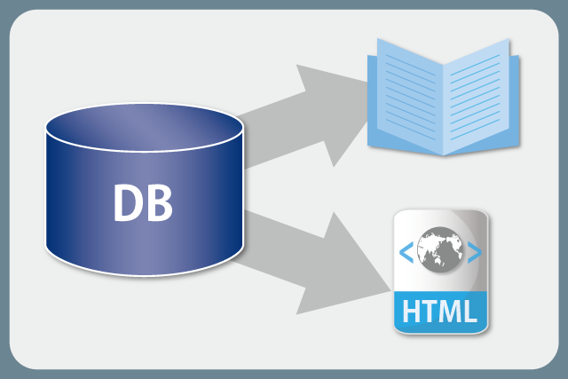 「PMX」では、変化に強いXMLデータベースでコンテンツを一元管理しているため、HTML形式による電子マニュアルや自動組版によるPDFをワンソースで出力できます。