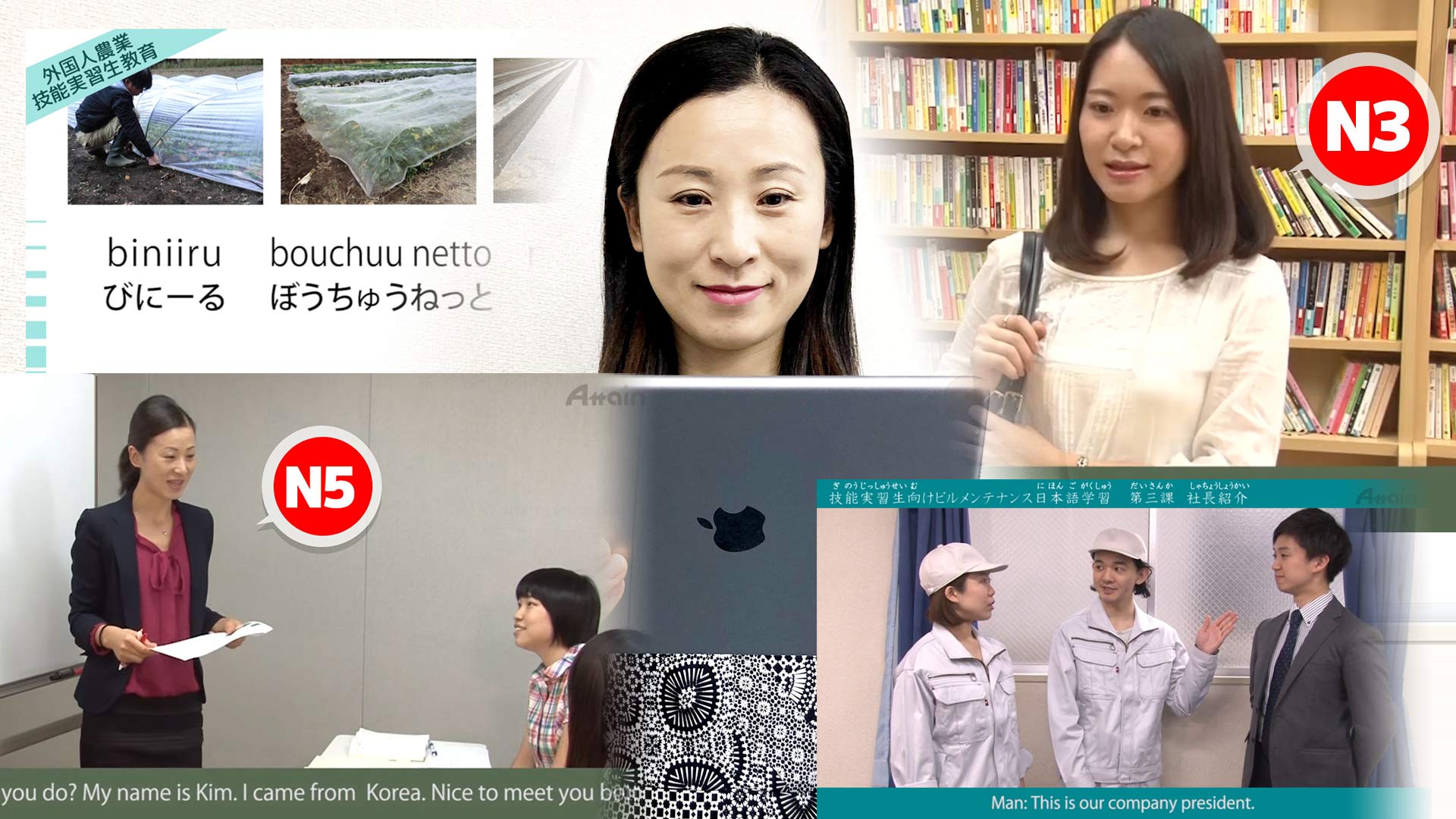 JLPT日本語能力試験N5~N1に対応する大ボリューム映像教材(模擬試験有)に加え、初学者向けの入門講座もご用意。ビジネスの現場で役に立つ、ビジネス日本語やビジネスマナー教材等、これらを多言語対応した全てを定額でご提供。現在は、英語・中国語・ベトナム語に対応、ミャンマー語・インドネシア語等鋭意制作中です。また、教育ご担当者・あるいは日本語教師のレベルアップ向けに、日本語教師養成コースもあります。