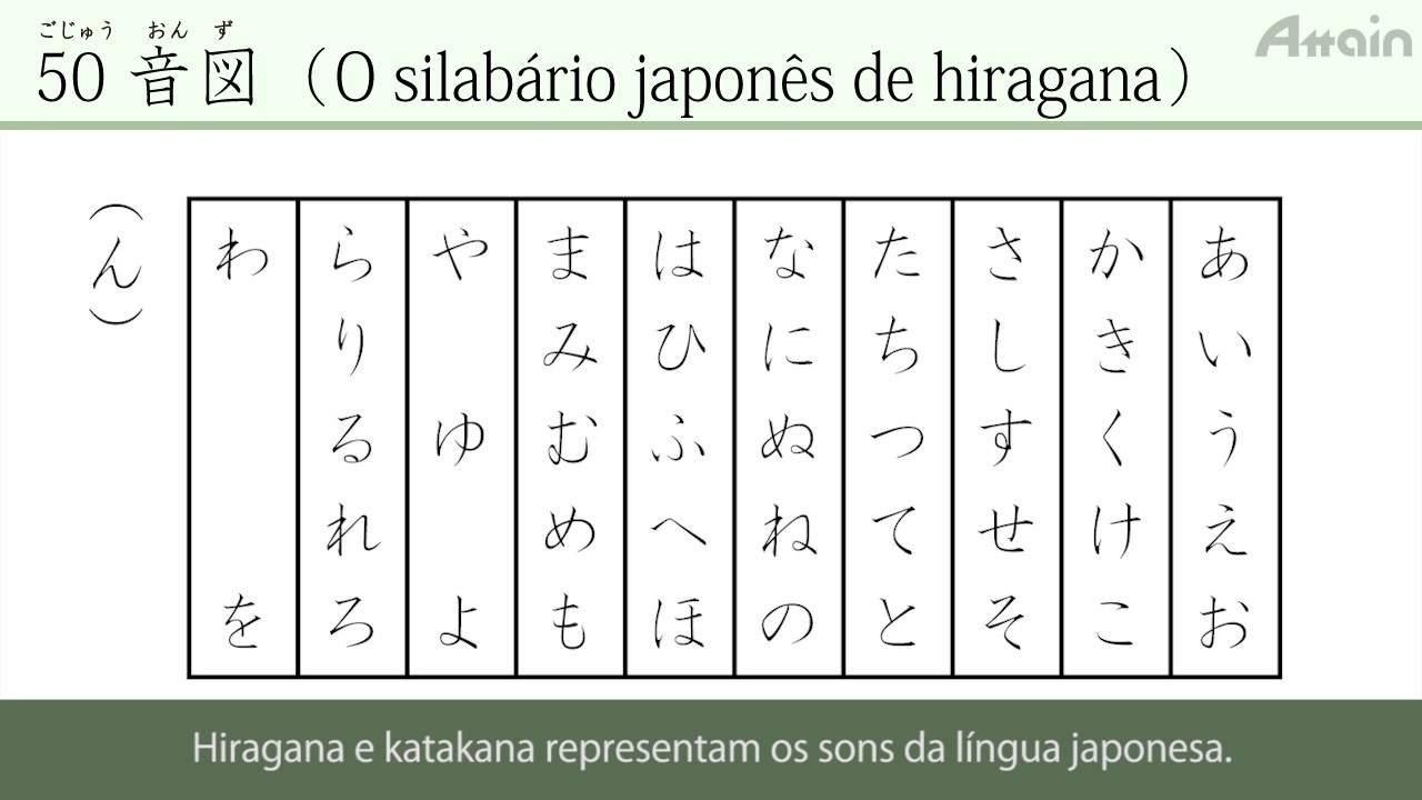 各課に印刷して何度でも使える書き取り練習シート付きの学習テキストがPDFで付属します。これらを使っての実際の学習時間は50時間を想定(個人差有り)しています。内容としては、ひらがなの発音と書き方、カタカナの発音と書き方、長音、撥音、促音、拗音、アクセント、あいさつの会話と表現を学習することができます。またすべての音声にポルトガル語字幕が付いているので、全くの日本語初心者でも学習することができます。第12課は会話のレッスンであり、日本語の発音と書き方を習得した上、日常生活の会話と表現を習得することができます。